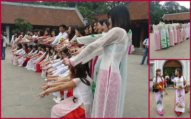 Nous arrivons maintenant devant le "temple de la littérature" construit en1070 , il a fait fonction d'établissement d'enseignement supérieur pendant 7 siècles et en particulier servait à l'instruction des mandarines. Ce jour il y a une manifestation originale: les étudiants font une cérémonie pour une remise de diplômes (fictive) alors que les examens ne sont pas encore passés. Le mois de novembre est choisi car c'est en ce moment que le temps est le meilleur (fin de la saison des pluies, pas encore trop chaud) pour faire des photos de promo!!